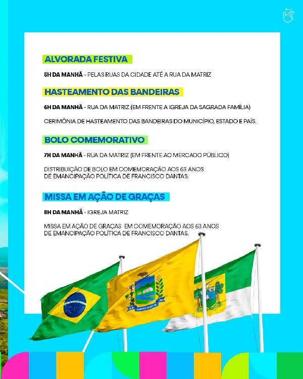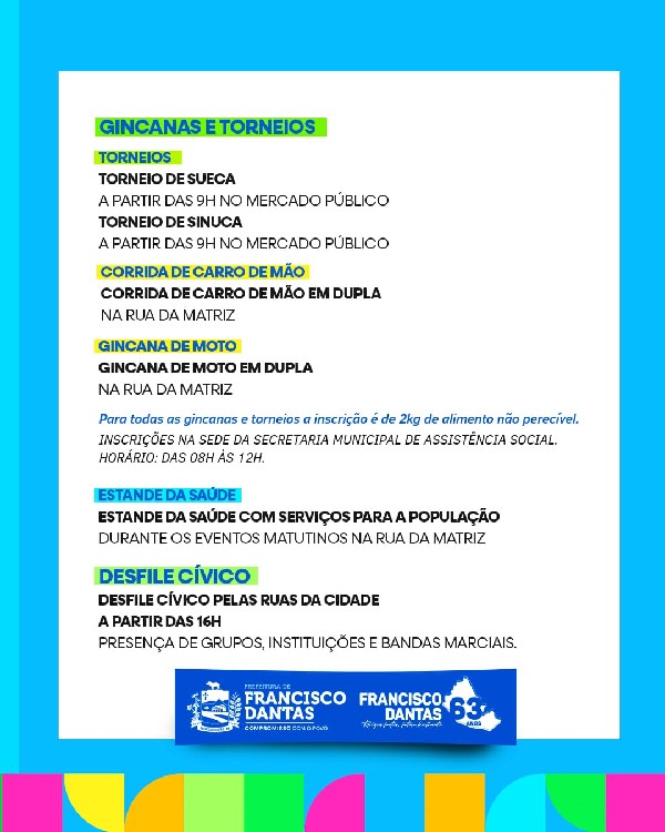 Alvorada festiva, hasteamento das bandeiras, bolo comemorativo, missa, torneios, gincanas, estande da saúde, desfile cívico e muito mais!