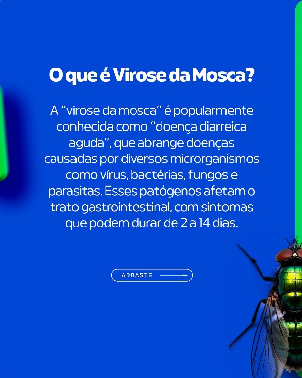 Com a chegada do período de chuvas, aumenta também a presença de moscas e, consequentemente, os casos da chamada "virose da mosca", uma infecção que pode causar desconfortos gastrointestinais e afetar pessoas de todas as idades. Durante esse período, é fundamental redobrar os cuidados com a higiene dos alimentos, das mãos e dos ambientes, evitando a contaminação e a propagação do vírus. Pequenas atitudes fazem toda a diferença: Mantenha alimentos sempre bem protegidos Higienize bem as mãos antes das refeições Evite consumir alimentos expostos Mantenha lixeiras sempre fechadas Fique atento aos sintomas. Caso eles se intensifiquem ou persistam, procure imediatamente a Unidade Básica de Saúde (UBS).